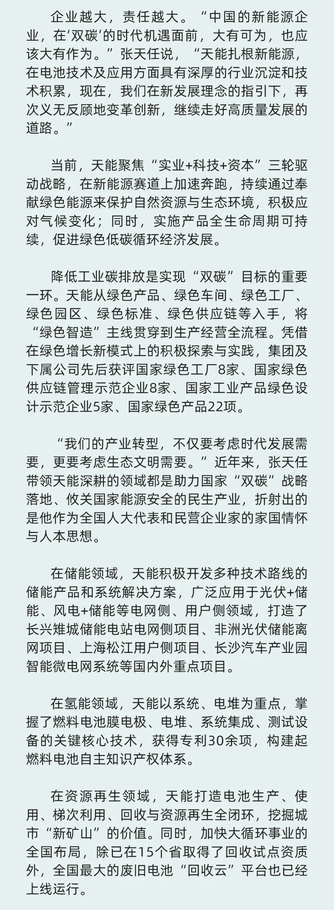 全国“两会”正在进行中,全国人大代表、必一运动控股集团董事长张天任提出了高质量建设新型储能体系、尽快出台强有力氢气补贴、加强回销一体化示范项目推广、鼓励各类电池技术平行发展等具体建议,为推动能源转型,守护绿水青山积极建言献策。